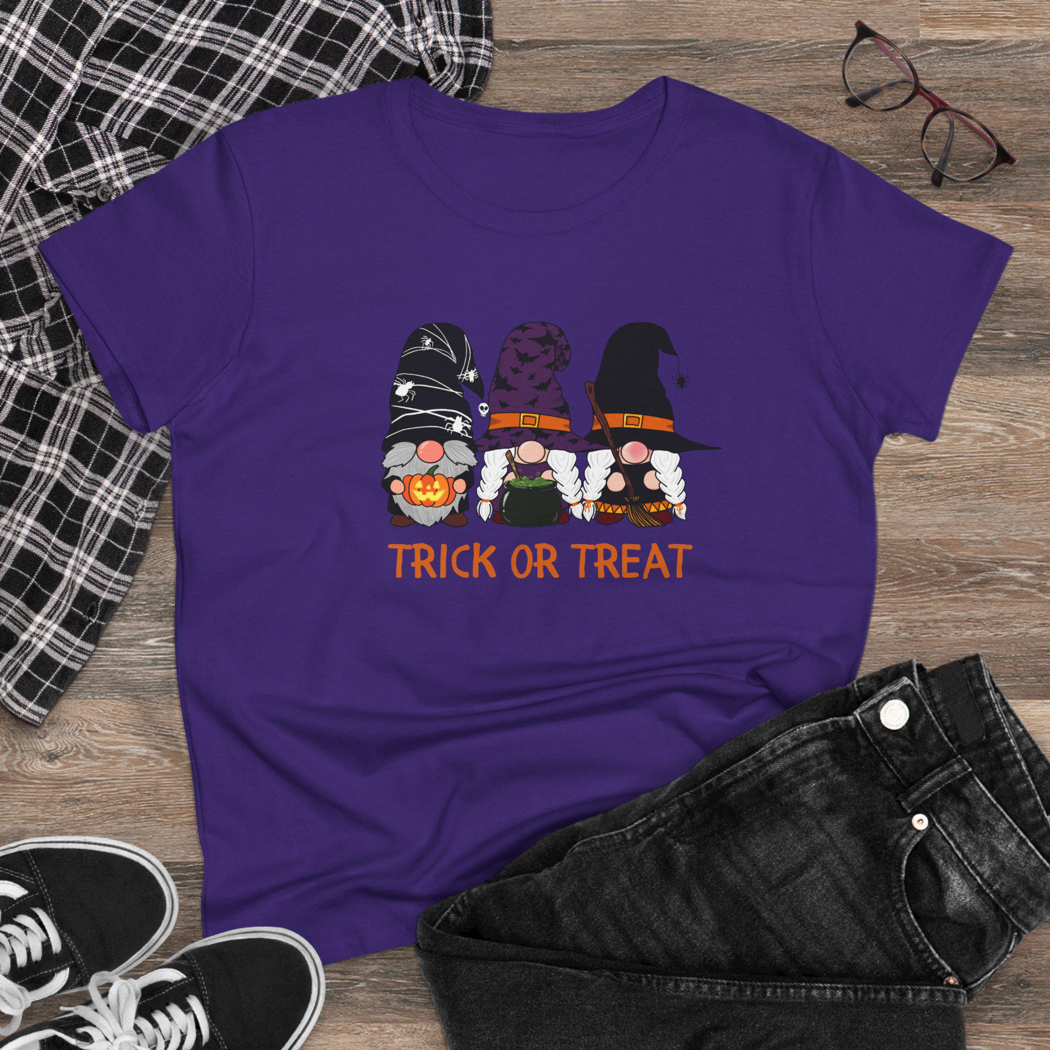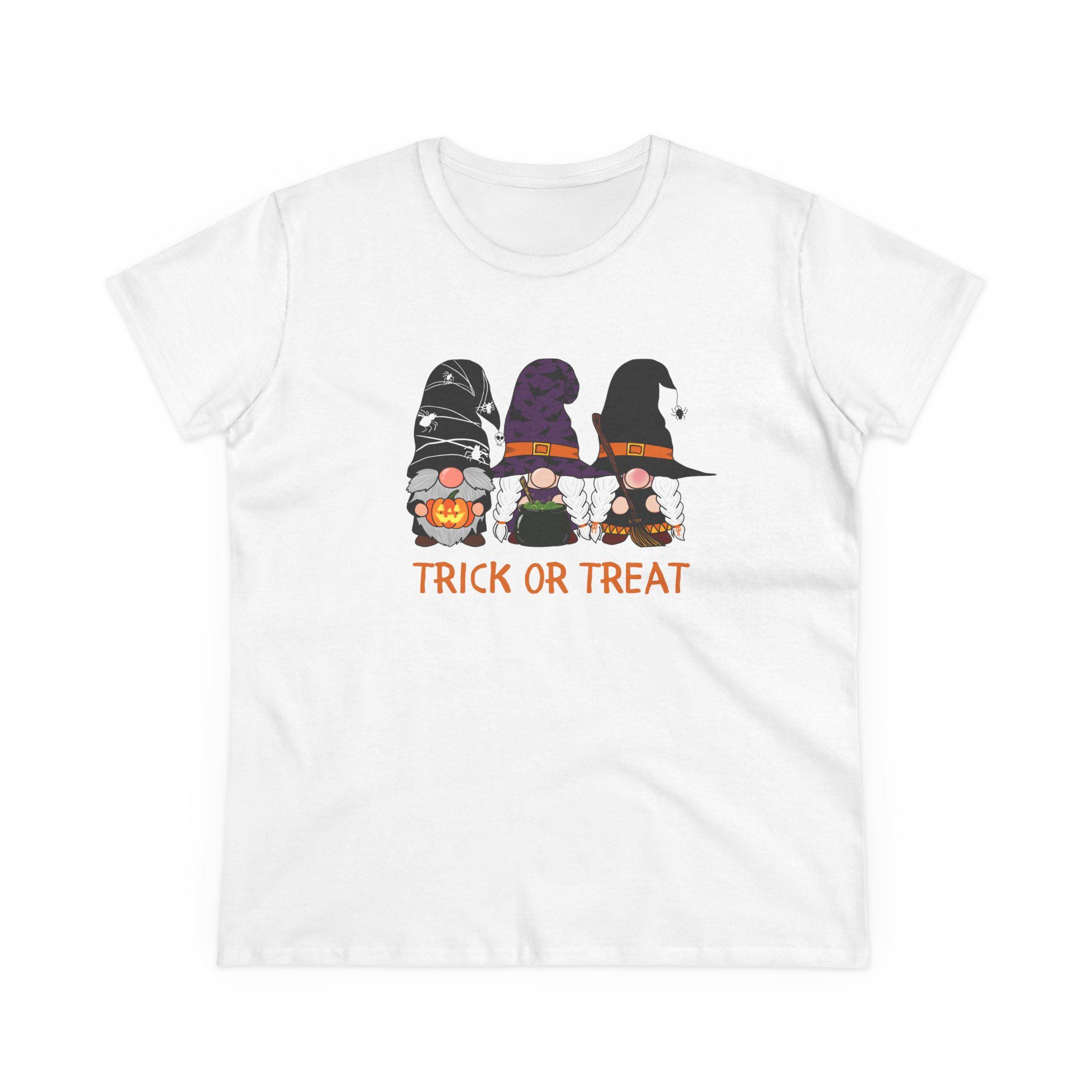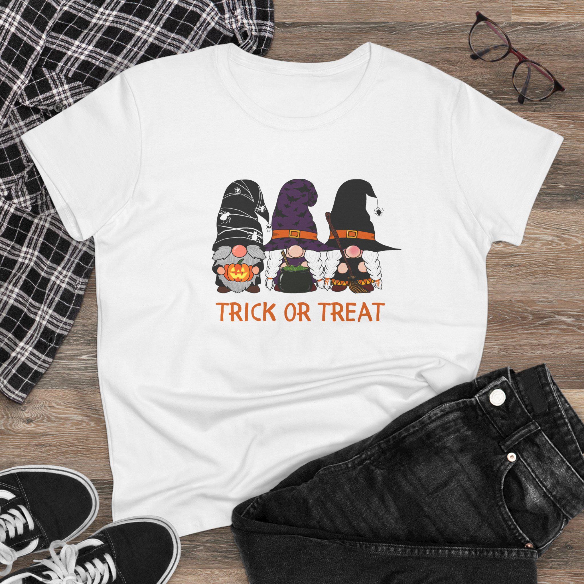 Embrace the festive spirit with this playful women's midweight cotton tee, perfect for celebrating Halloween or any fun occasion. Featuring an adorable 'Trick or Treat' design, this shirt radiates charm and whimsy. Its semi-fitted cut makes it a flattering choice for all body types, providing both comfort and style. Dress it up with a cute skirt for a Halloween party or pair it with jeans for a cozy evening out. This tee is ideal for women who love to showcase their festive spirit while staying comfortable. Great for Halloween celebrations, costume parties, or as a delightful gift for friends and family during the spooky season!