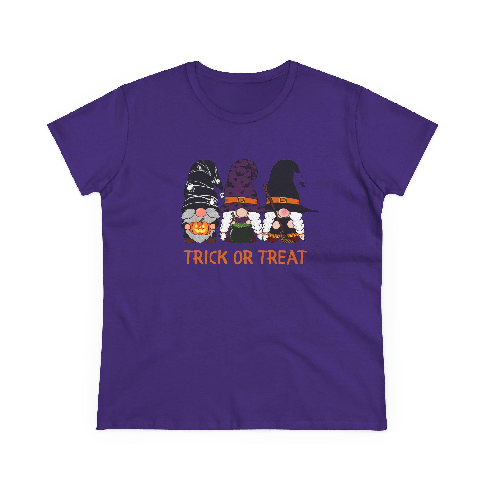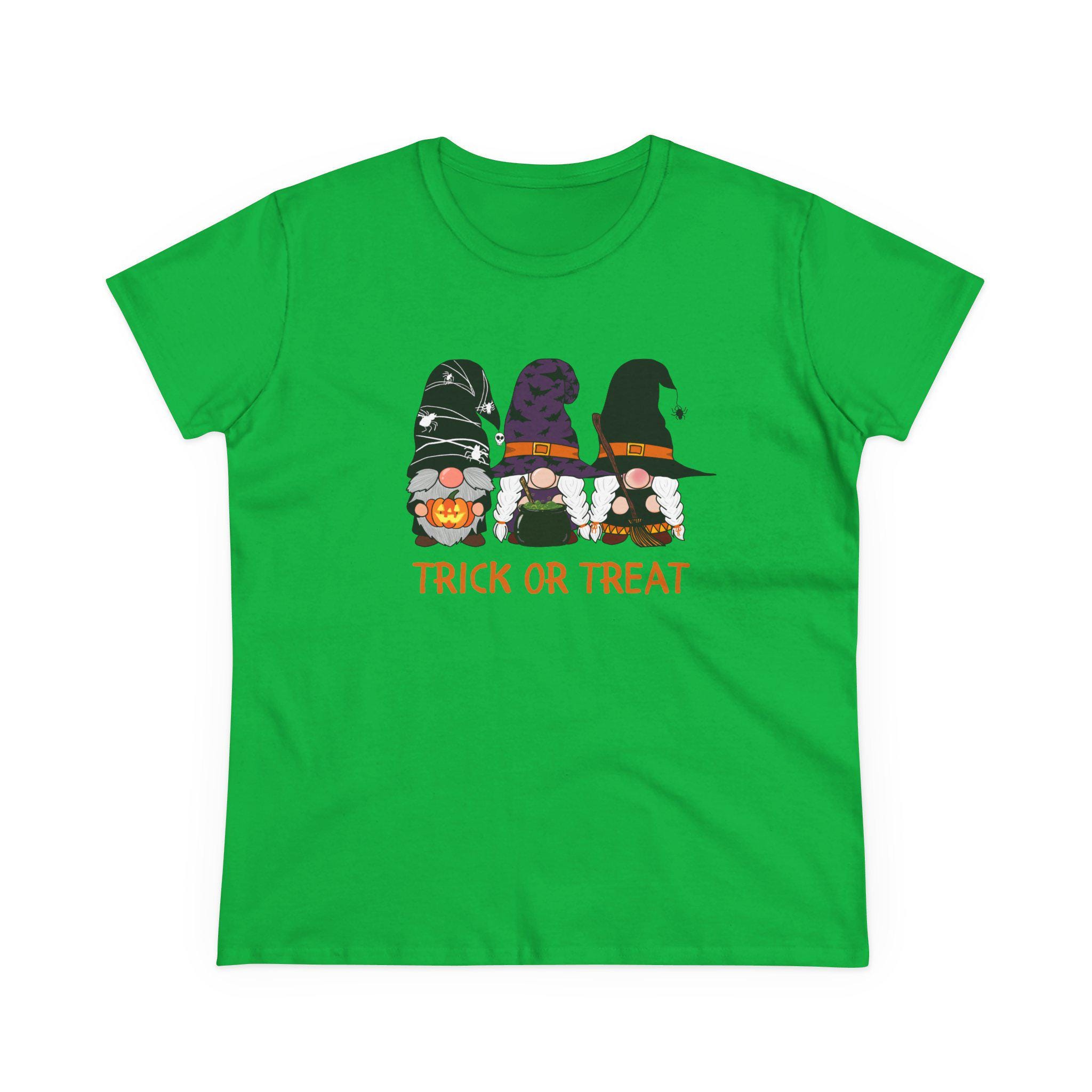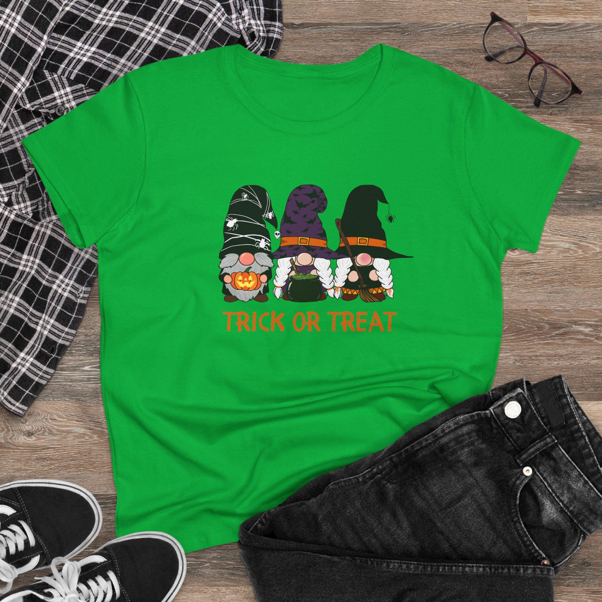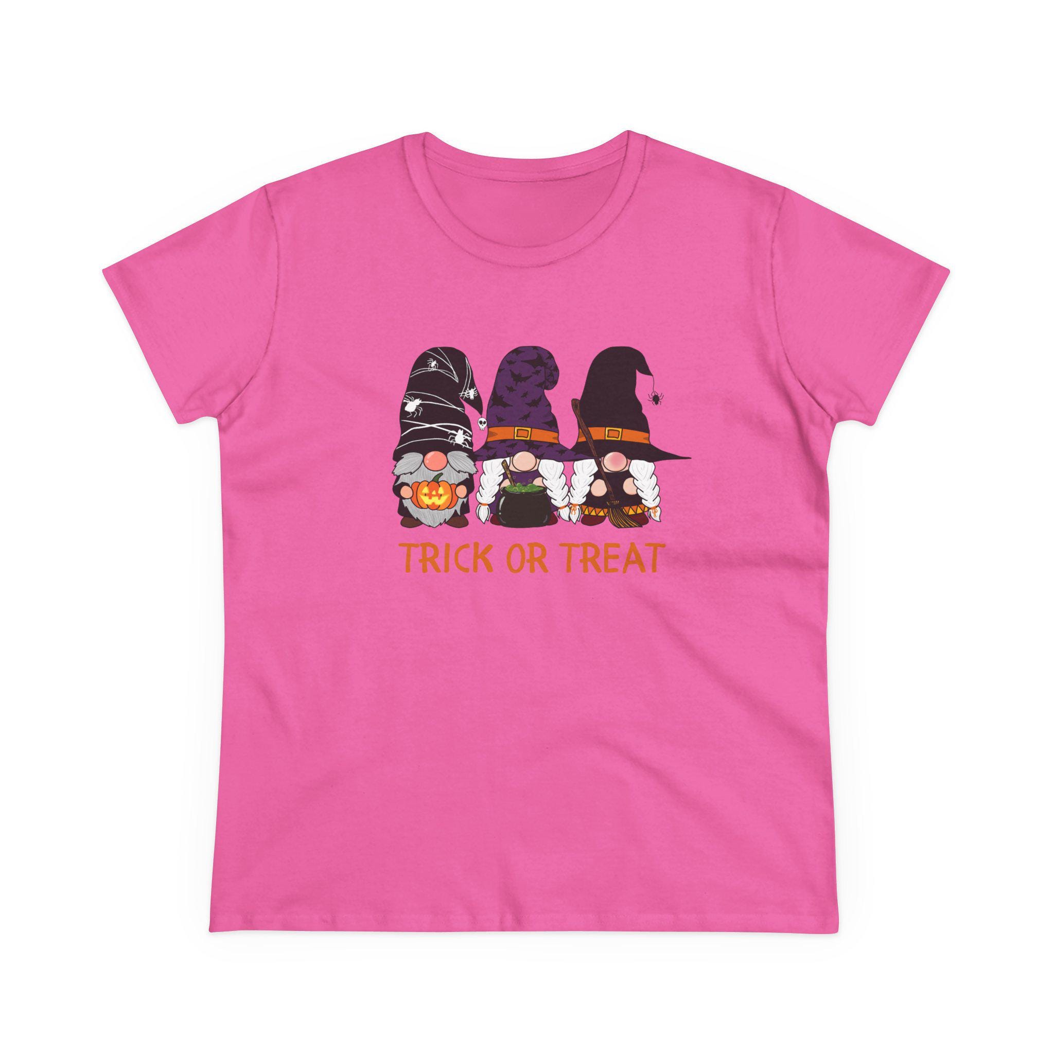 Embrace the festive spirit with this playful women's midweight cotton tee, perfect for celebrating Halloween or any fun occasion. Featuring an adorable 'Trick or Treat' design, this shirt radiates charm and whimsy. Its semi-fitted cut makes it a flattering choice for all body types, providing both comfort and style. Dress it up with a cute skirt for a Halloween party or pair it with jeans for a cozy evening out. This tee is ideal for women who love to showcase their festive spirit while staying comfortable. Great for Halloween celebrations, costume parties, or as a delightful gift for friends and family during the spooky season!