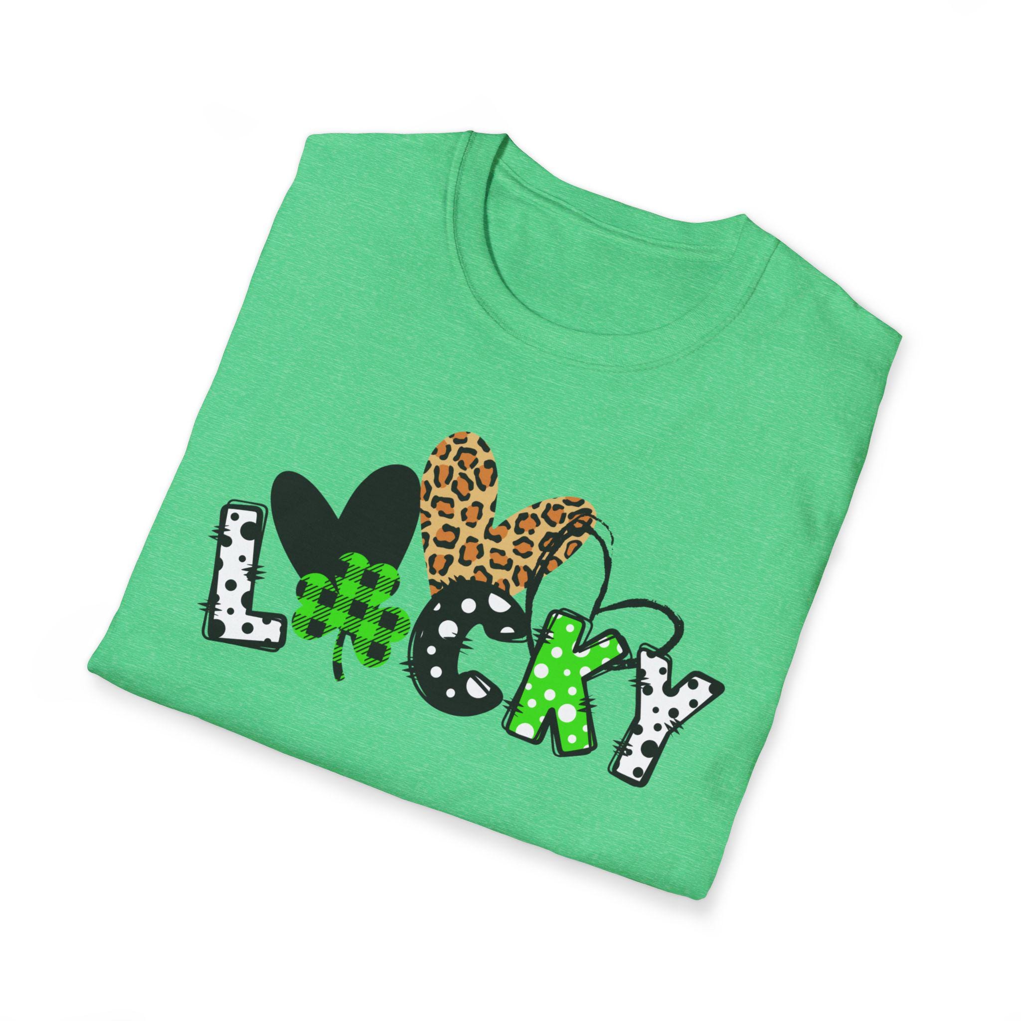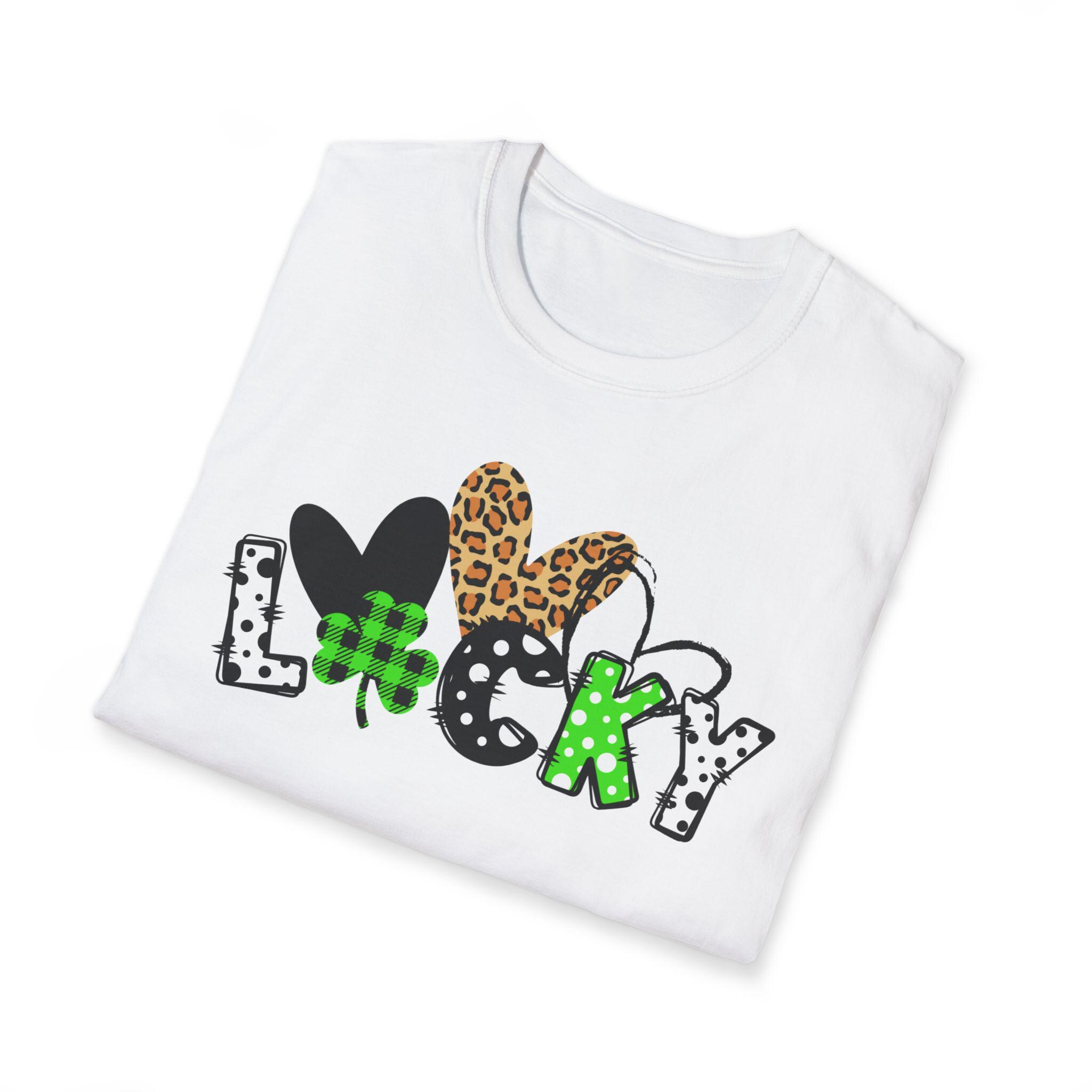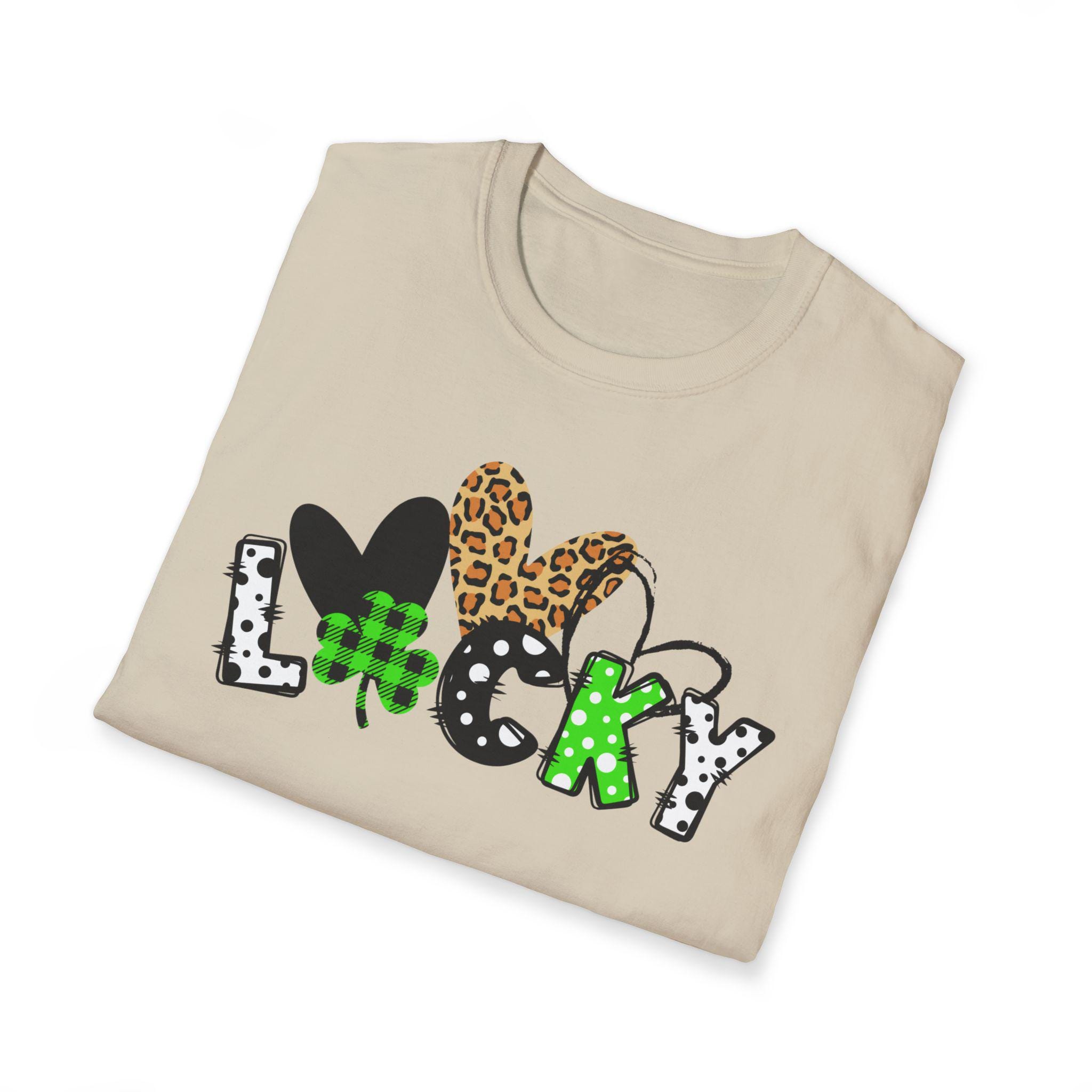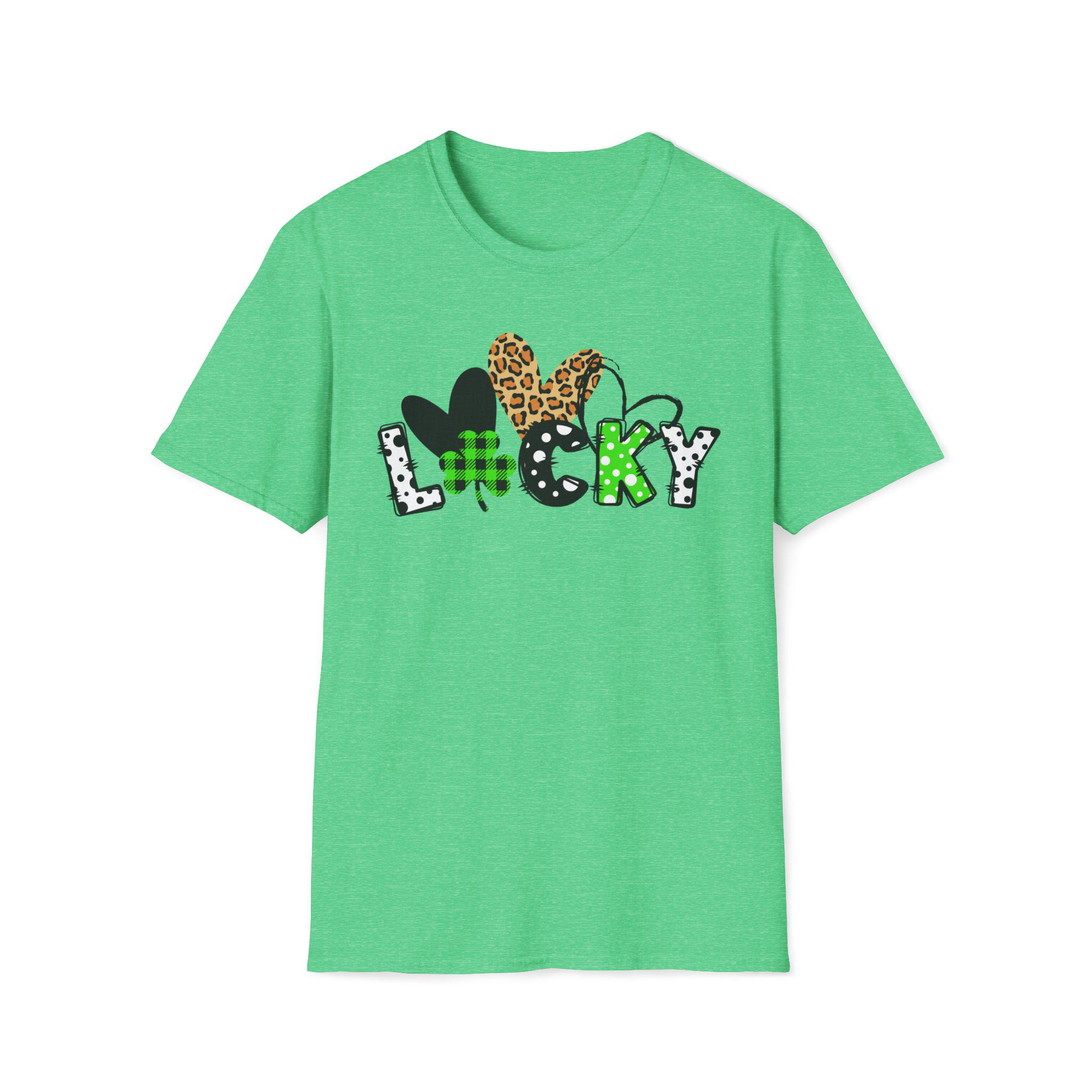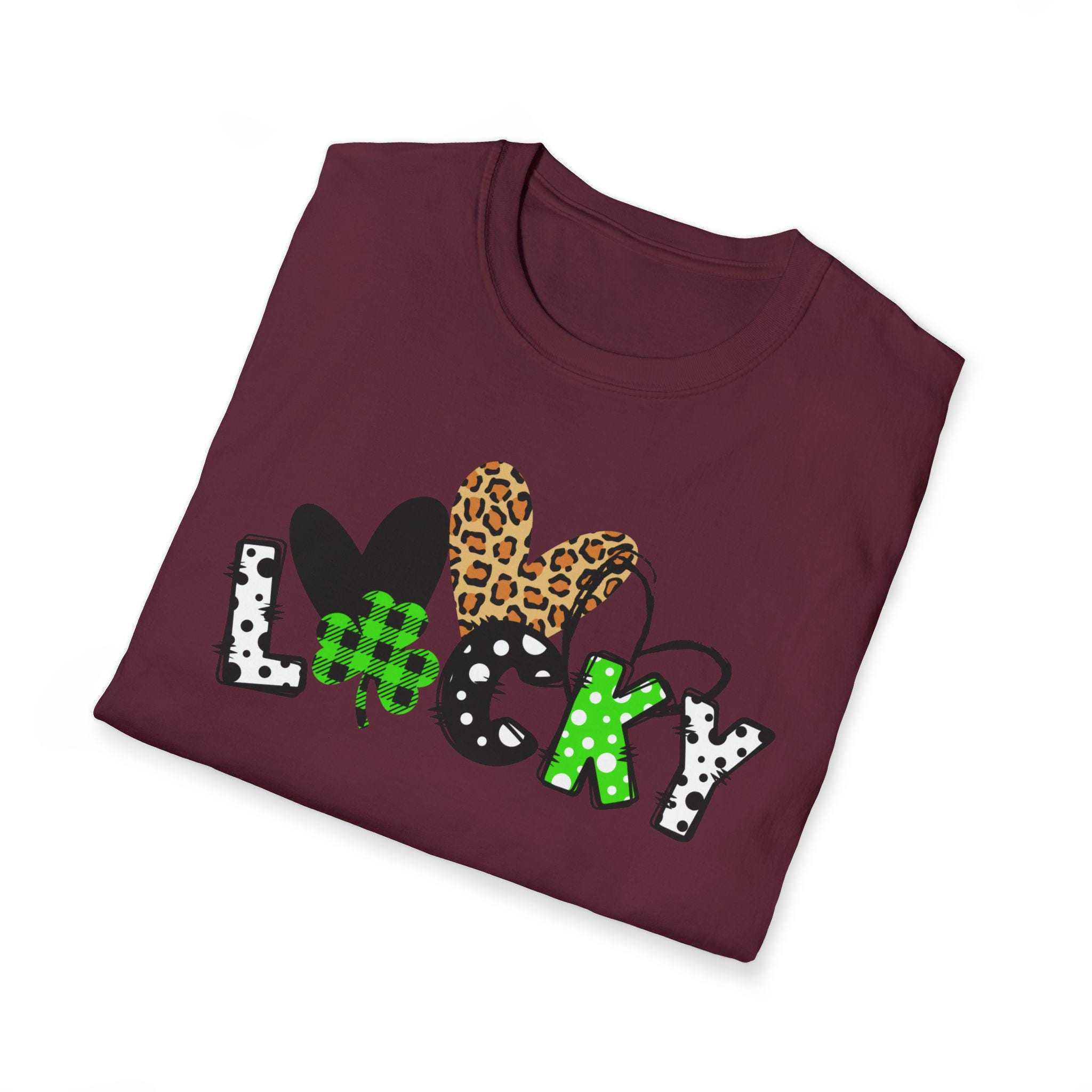 This lightweight crew-neck tee brings a playful, modern spin on St. Patrick’s Day flair. Bold mixed-pattern letters spell out “LUCKY,” each character layered with a different texture—dalmatian dots, leopard print, classic black, and a bright green plaid shamrock—so the design feels lively and handcrafted. Wear it when you want an approachable, spirited look that reads fun without trying too hard. The shirt’s soft feel and clean silhouette make it easy to layer under a denim jacket or wear solo while you weave through parades, casual meetups, or cozy pub nights. It’s the kind of tee that starts conversations and adds a cheeky, stylish note to an ordinary day.